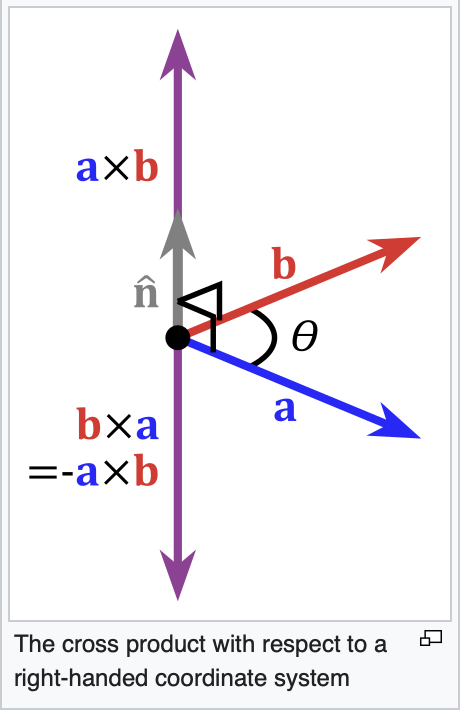 This cross product has an important property: going from \(v\) to \(\times v\) involves a 90° rotation in the same direction as the rotation from the positive x-axis to the positive y-axis.