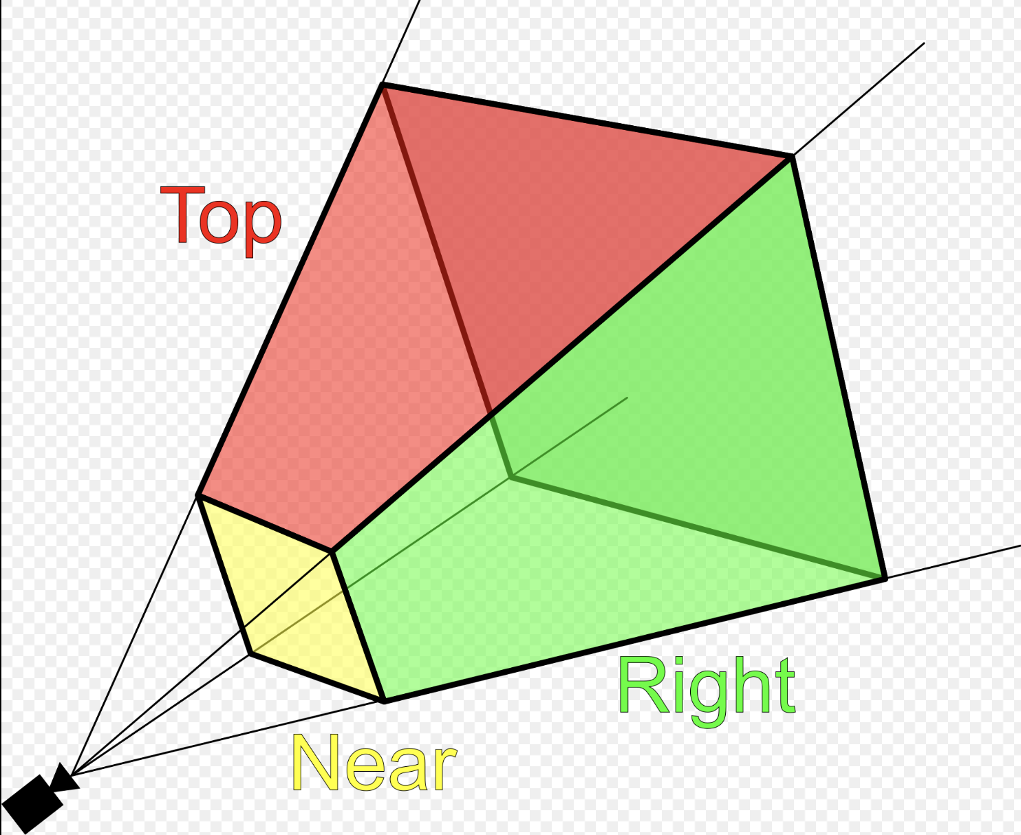 In world (or view) space, the view frustum is bounded by six arbitrary planes, each defined by a normal vector \(\mathbf{n}\) and distance \(d\).