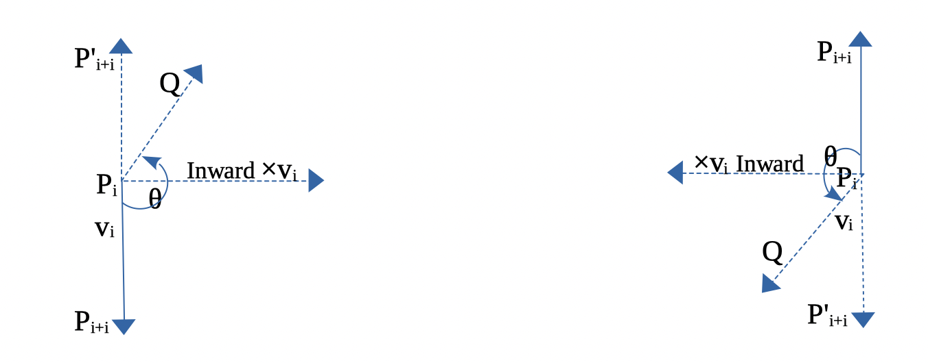 Using the right-hand rule and counter-clockwise order, any vector \(P_iQ\) between \(P_iP_{i+1}\) and \(P_iP'_{i+1}\), with angle \(\theta\) such that \(0^\circ < \theta < 180^\circ\), indicates the inward direction.