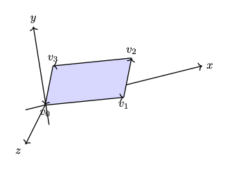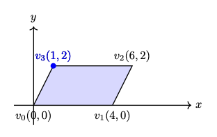 In 2D geometry mathematics, \(v_0, v_1 and v_2\) can form the area of a parallelogram as shown in Fig. 17. The fourth vertex, \(\mathbf{v}_3\), can then be determined to complete the parallelogram.