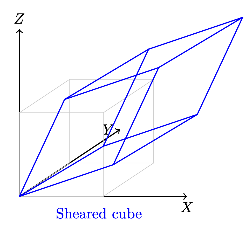 \(\text{Shear}_X(a,b)= \begin{bmatrix}1&a&b&0\\0&1&0&0\\0&0&1&0\\0&0&0&1\end{bmatrix} \begin{bmatrix}X\\Y\\Z\\1\end{bmatrix} = \begin{bmatrix}X + aY + bZ\\Y\\Z\\1\end{bmatrix}\)