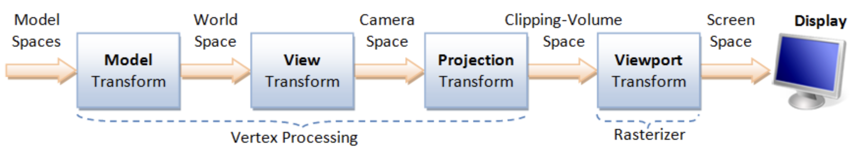 M= Model matrix (object → world)V= View matrix (world → camera)P= Projection matrix (camera → clip space)