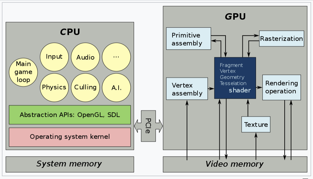 Fig. 6 OpenGL and Vulkan are both rendering APIs. In both cases, the GPU executes shaders, while the CPU executes everything else [2].¶