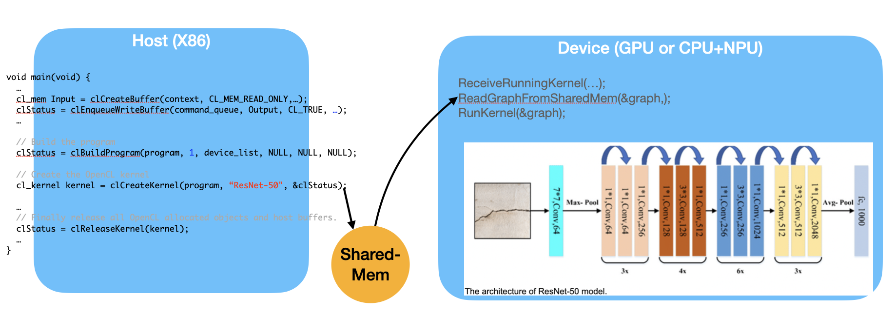 As shown in Fig. 96, the Device, such as a GPU or a CPU+NPU, is capable of running the entire ML graph. However, if the Device has only an NPU, then operations like Avg-Pool, which require CPU support, must run on the Host side. This introduces communication overhead between the Host and the Device.