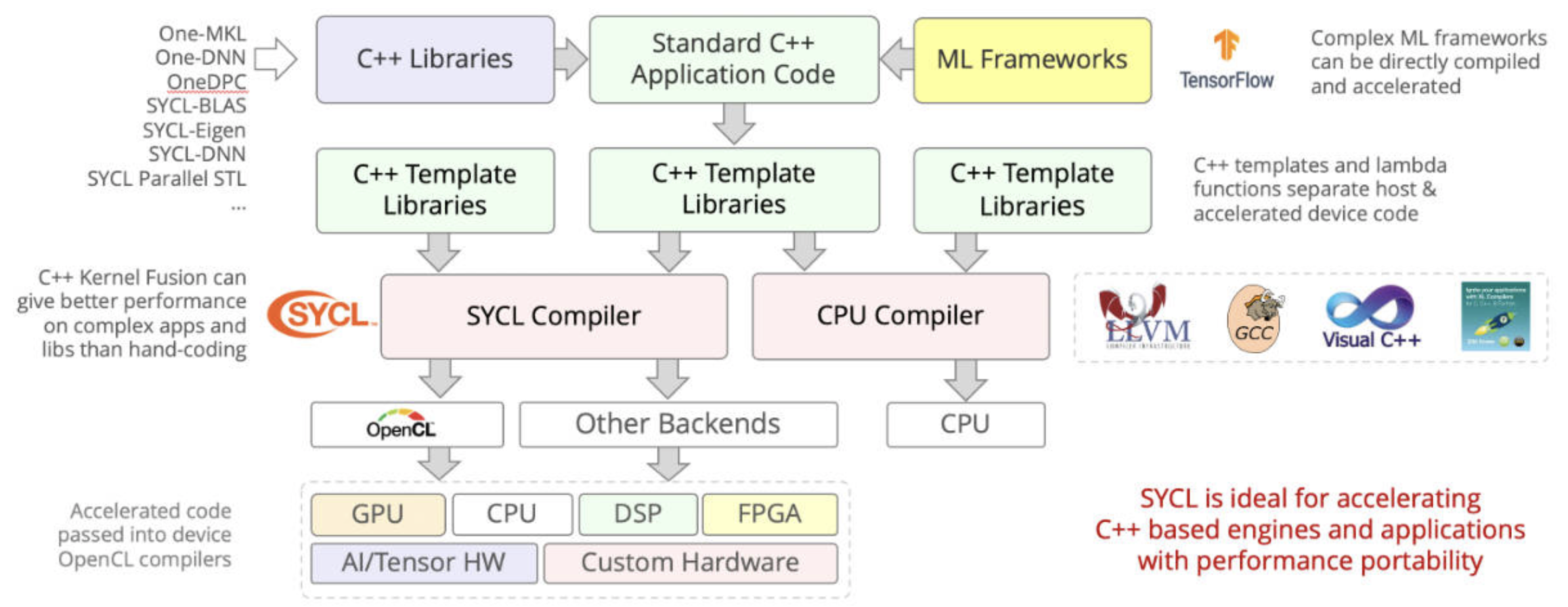 Fig. 97 SYCL = C++ template and compiler for Data Parallel Applications on AI on CPUs, GPUs and HPGAs.¶